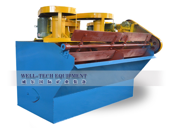 XJK型漂浮选矿机是我国使用较为普遍的一种漂浮选矿机。这种漂浮选矿机的构造如图6—34所示。一般四个槽子配成一组,分为吸入槽(有吸浆管22)与直流槽(无吸浆管)。漂浮选矿机工作时,电机通过皮带轮19和13带动主轴3旋转,叶轮5随主轴3一同旋转。这样在盖板7和叶轮5之间形成局部真空区(负压区),空气由吸气管11经空气筒22被吸人,同时矿浆经吸浆管22被吸入,矿浆与空气混合后借叶轮旋转所产生的离心力,矿浆中的空气...