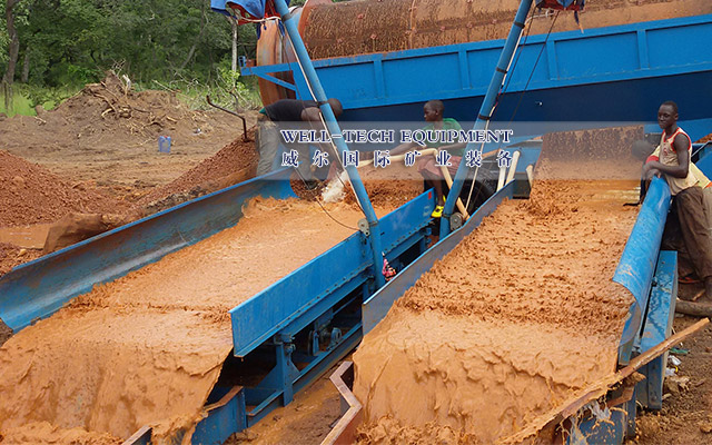 溜金槽又稱鼓動溜槽將原有的鐵制底板改為橡膠底板,再加上簡單的偏心鼓動機構,使橡膠底板做上、下往復運動,每個溜格之間類似于跳汰機的隔膜作用。從而解決了溜格的板結現象,提高了金的回收率。由于溜金槽是間斷排出精礦.