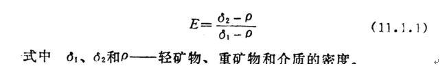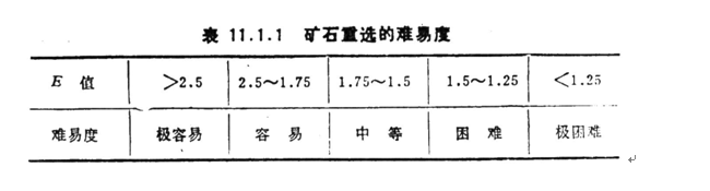 根據E值可將礦石的量選難易度分作五級,如表11.1.1所示。 E值愈大愈易選。同樣礦石在粒度增大或入選粒度范圍變窄時.分選也會變得容易。上述按E值的判斷是粗略的,隨著設備的改進和分選條件的完善·原來屬于分選困難的礦石也將變得容易了。