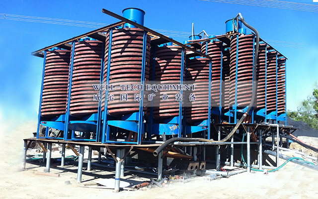 經破磨至合理細度的鉻礦石細料,通過螺旋分級機借助固體顆粒的比重不同而在液體中沉淀的速度的不同,對礦石混合物進行清洗、分級。再用跳汰機、搖床對物料進行洗選,運輸至螺旋溜槽分選細粒度的礦粉,篩分之后經過送入浮選機或磁選機,進入浮選的精礦經過濃縮機脫水,繼續送入烘干機烘干得到可以使用的干精礦或者二次研磨繼續提取礦物。