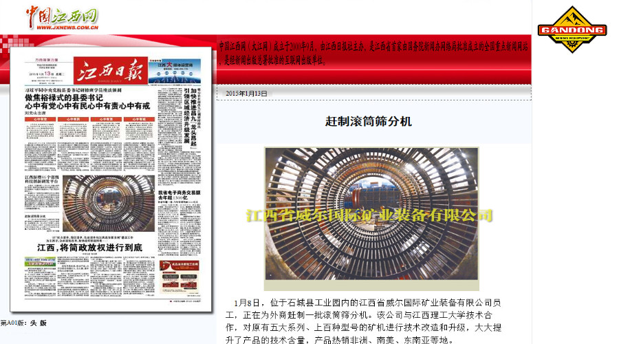 2015年1月13號江西日報.中國江西網【第A01版】頭版報道我公司出口滾筒篩分機加工現場,新聞內容: