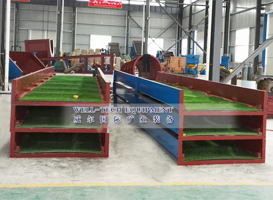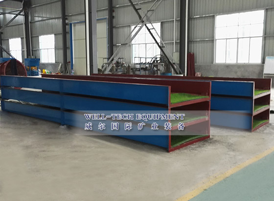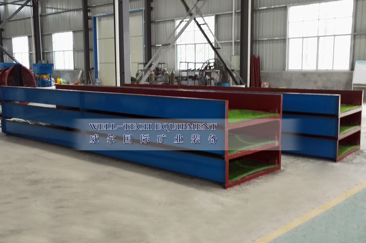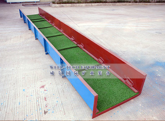 粘金溜槽是以前最受歡迎的選金設備之一,通常由溜槽體、溜槽格和粘金毯組成。粘金溜槽通常用于砂金選廠,廣泛地與滾筒篩組合一起使用可直接回收黃金。