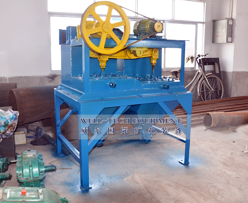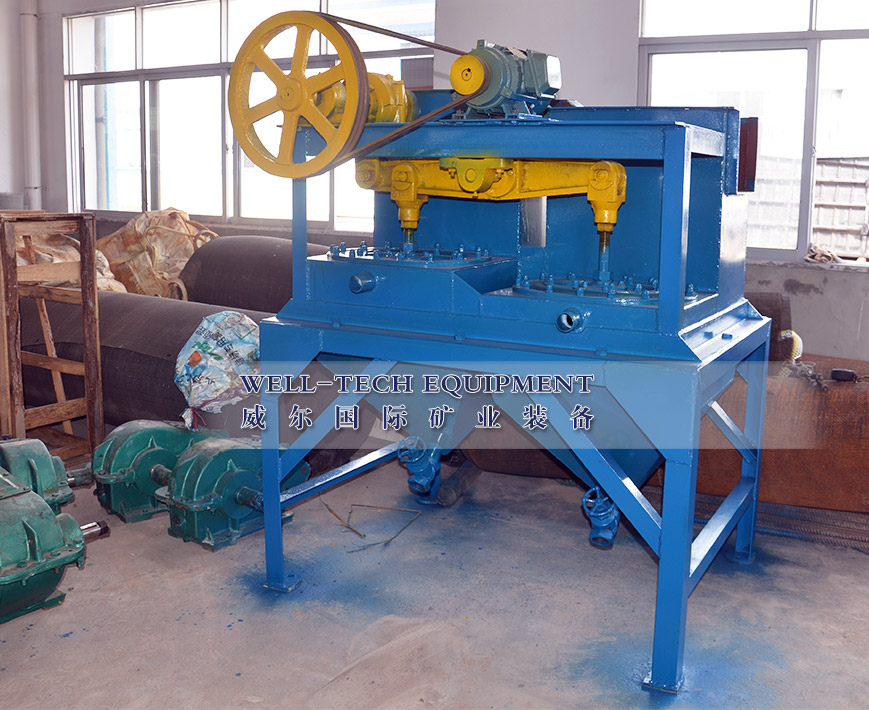 雙斗隔膜跳汰機結構由:機身、傳動裝置、分水器、隔膜和活栓等主要部分組成,機體有兩個大小的跳機斗,每個隔膜斗用不到底的隔板將其分成跳汰區和隔膜區兩部分。跳汰過程是靠橡膠隔膜作上下往復運動所造成介質(水)的鼓動來進行。電動機通過三角皮帶帶動大皮輪轉動,使偏心軸上的連桿上下運動,與此連桿連接的搖臂也上下運動,搖臂上另有二連桿連接橡膠隔膜、從而使隔膜獲得上下往復運動,進行跳汰。