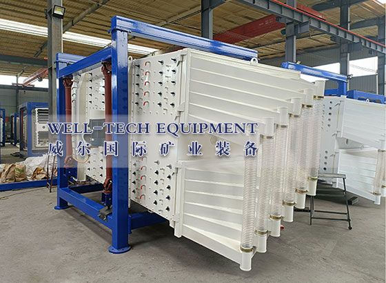 方形搖擺篩的工作原理為:搖擺篩啟動后,設備搖動體即篩箱在慣性力的作用下作前后往復運動,篩箱和篩面連體作周期性搖動,從而使篩面上的物料隨篩箱一同作定向跳躍式運動。期間,小于篩孔的物料通過篩孔落到下層,成為篩下物,大于篩孔孔徑的物料經連續翻滾跳躍運動后從排料口排出,從而完成篩分工作。