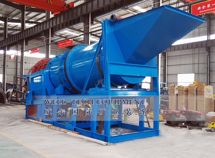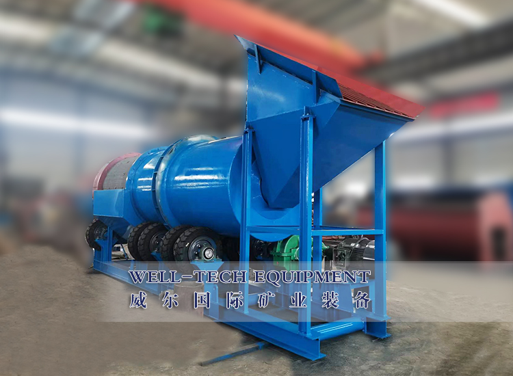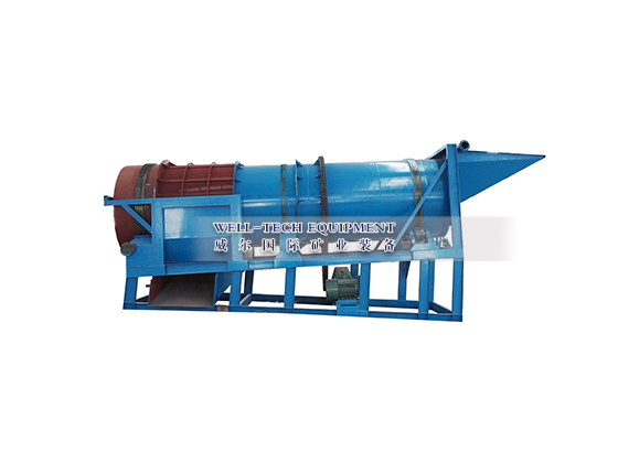 圓筒洗礦機利用旋轉的圓筒和內部的刮板以及物料中自有的卵石和巖石來分解粘土,塊狀物和軟氧化物。洗礦機的圓筒慢慢地旋轉,類似于一個巨大的洗衣機。粗細不同的物料還有水同時在一起翻滾攪動,有效地把有用礦物從泥性土壤,粘土中釋放出來。分散均勻后漿狀般的物料被圓筒送到尾端,并從溢流口排到錐形篩進行篩分。錐形篩把大于有用礦物的粒度的物料排除,篩下的礦漿即可直接進入各種各樣的選礦設備,如離心選礦機,螺旋溜槽,跳汰機等。