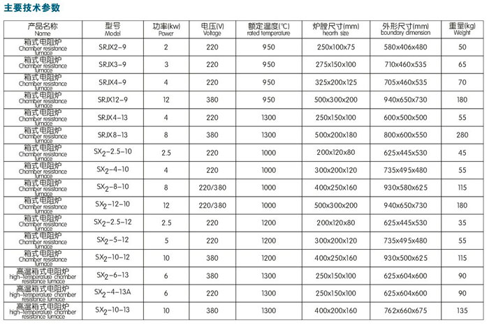 電阻爐均系周期作業式,供實驗室、工礦企業、科研等單位作元素分析測定和一般小型鋼件淬火、退火、回火等熱處理時加熱用。另其額定溫度為1300℃的高溫箱式電阻爐,可以作為合金鋼的熱處理及金屬燒結、熔解、分析等高溫加熱用電阻爐