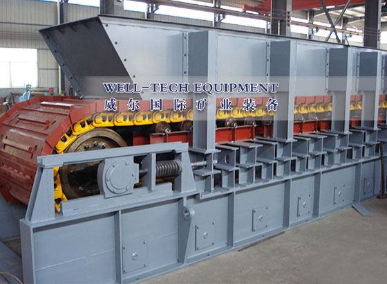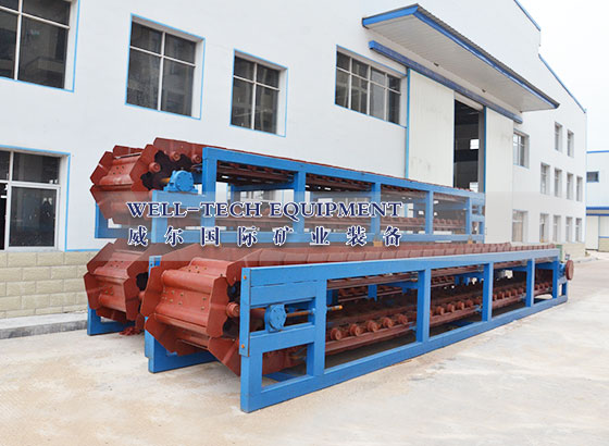 采用高強度模鍛鏈條為牽引件,兩根鏈條繞過安裝在機體頭部的一對驅動鏈輪和機體尾部的一對張緊輪聯成封閉形回路,在兩排鏈條的每個鏈節上裝配了相互交迭的、輕型結構的輸送槽而成為一個連續的能夠運載物料的輸送線路。其自重和物料的重量由安裝在機體上的多排支重輪、鏈托輪和滑道梁支承。傳動系統經交流變頻調速電動機聯接減速機,再由漲套與驅動裝置直聯驅動運載機構低速運行。將尾部料倉卸入的物料沿輸送線路運至機體的前方排出,實現向下方的工作機械連續均勻喂料的目的。產品最大優點在于,在惡劣環境下具有,適應性強、耐磨損、使用壽命長等特點。