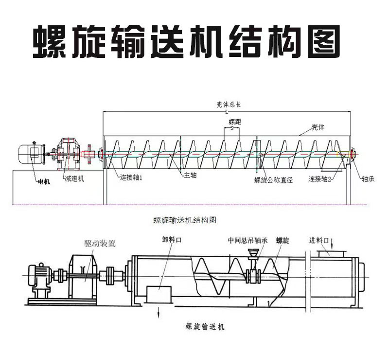 螺旋輸送機又稱螺旋上料機.蛟龍.輸送機,由驅動裝置封閉槽箱和螺旋組成,借螺旋轉動將槽箱體內的物料推移輸出,使物料不與螺旋輸送機葉片一起旋轉的力是物料自身重量和螺旋輸送機機殼對物料的摩擦阻力。技術參數: